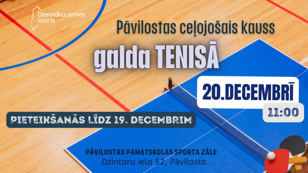 Sestdien, 20. decembrī, Pāvilostas pamatskolas sporta zālē norisināsies ikgadējās galda tenisa sacensības “Pāvilostas ceļojošais kauss 2025”. Aicinām piedalīties Dienvidkurzemes novada un apkārtējo novadu iedzīvotājus ar galda tenisa priekšzināšanām, sākot no 12 gadu vecuma, sieviešu vai vīriešu kategorijā.