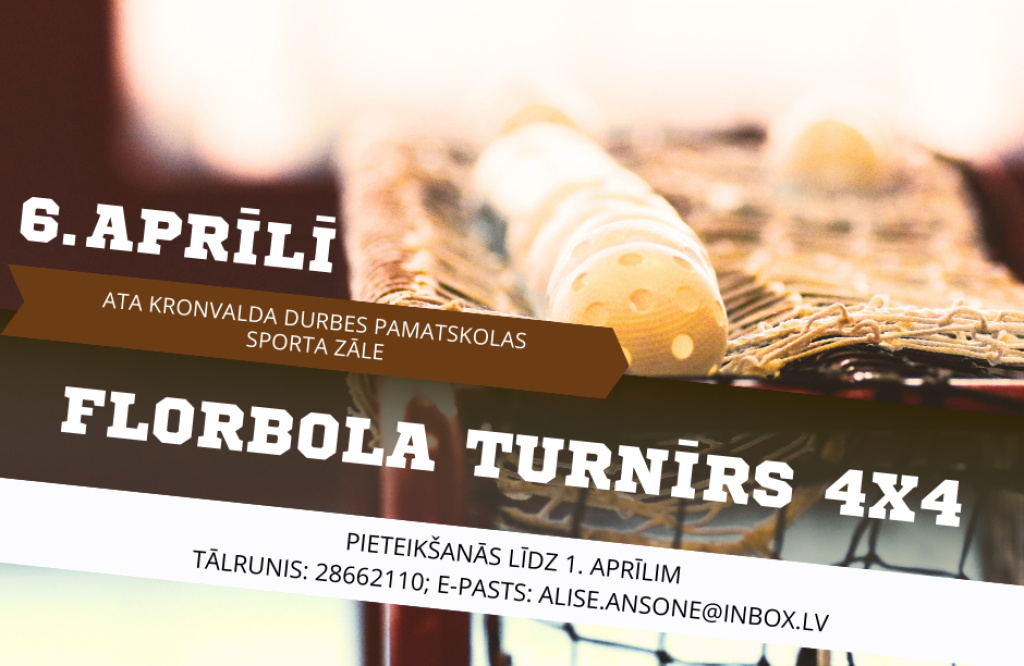 Pirmdien, 6. aprīlī Ata Kronvalda Durbes pamatskolas sporta zālē notiks florbola turnīrs 4x4, kurā aicinātas piedalīties komandas gan no Dienvidkurzemes novada, gan citām pašvaldībām. Turnīra sākums - plkst. 9.00.