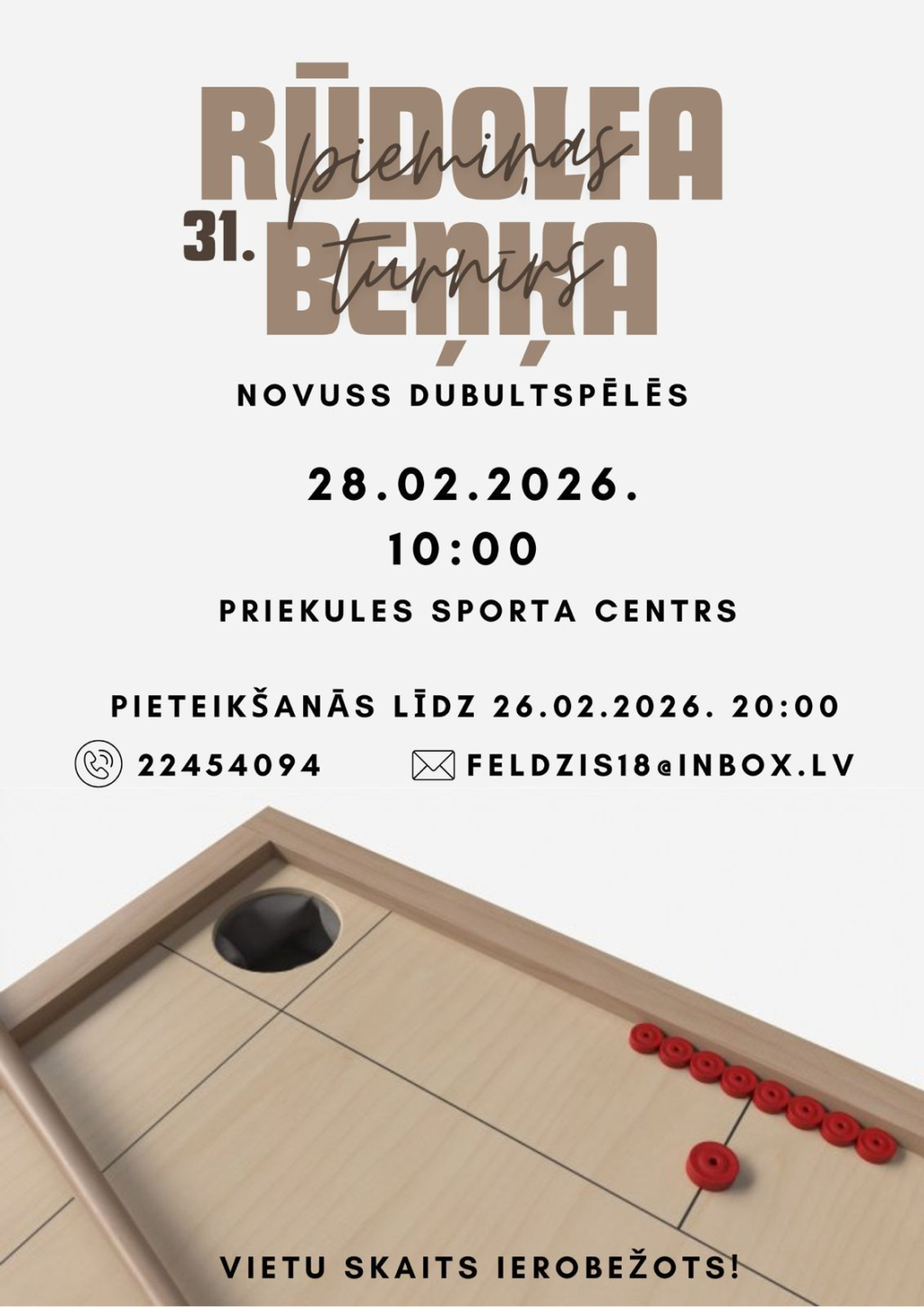 Sestdien, 28. februārī Priekulē notiks Rūdolfa Beņķa piemiņas turnīrs novusa dubultspēlēs – viens no senākajiem šī sporta turnīriem, kas šogad dalībniekus un skatītājus sagaidīs jau 31. reizi.