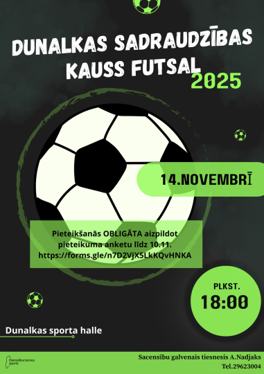 Dunalkas sporta hallē, 14. novembrī, plkst.18.00 sporta entuziastus pulcēs “Dunalkas Sadraudzības kauss FUTSAL 2025” – aizraujošs futbola turnīrs, kas veicina aktīvu dzīvesveidu un draudzīgu sacensību garu Dienvidkurzemes novadā.