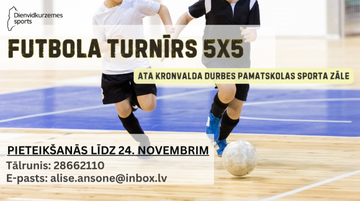 Piektdien, 28.novembrī Ata Kronvalda Durbes pamatskolas sporta zālē norisināsies futbola turnīrs 5x5, kas aicina pulcēties gan vietējos futbola entuziastus, gan komandas no apkārtējiem novadiem. Turnīra sākums – plkst. 19.00.
