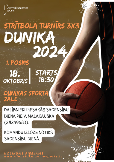 Dienvidkurzemes novada iedzīvotājiem un viesiem šoruden būs iespēja piedalīties aizraujošā strītbola turnīrā “Dunika – 2025”, kas norisināsies Dienvidkurzemes novada Dunikas pagasta Sikšņu sporta zālē.